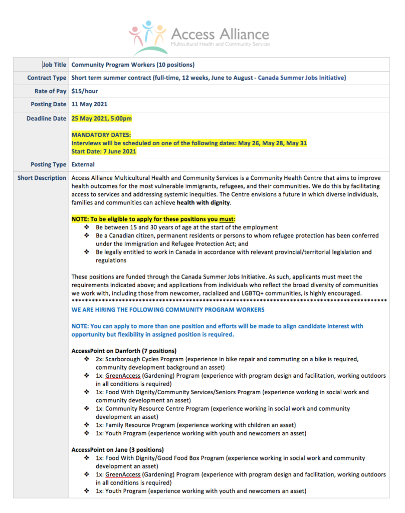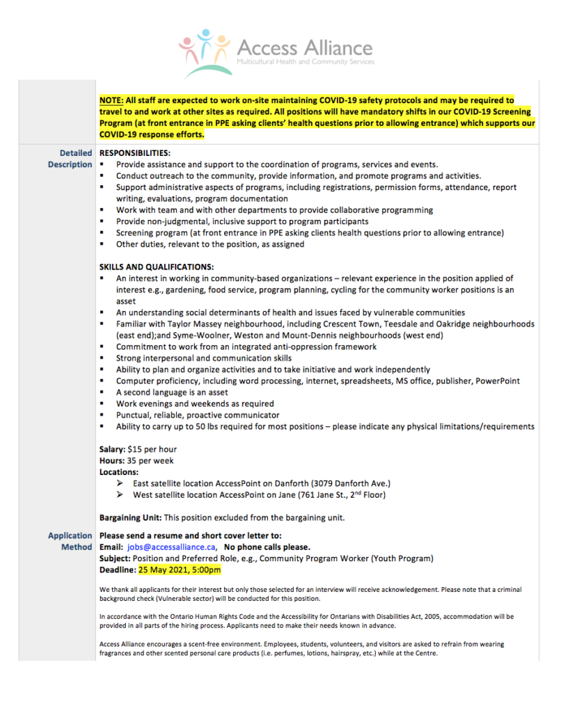 Job Opportunity: Community Program Workers (Summer, 12 Weeks, 2 Positions)May 11, 2021 PDF Download: Job Posting, Community Program Workers, Short Term Summer Contract (Full time, 12 Weeks)